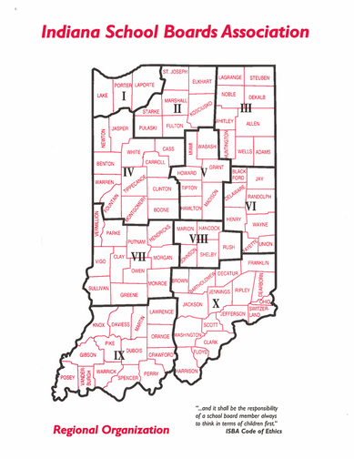 The Indiana School Boards Association is organized into 10 geographical regions.
