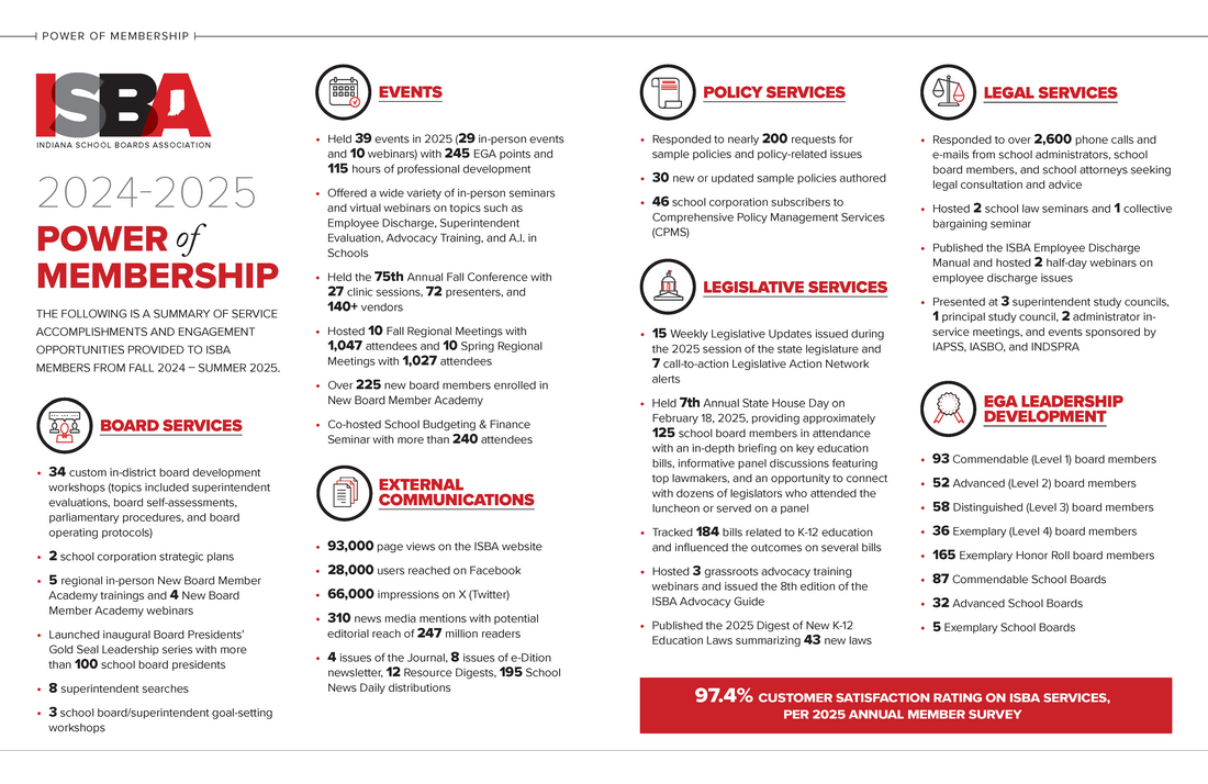 The Indiana School Boards Association empowers school boards with the resources necessary for highly effective governance and advocacy to support exceptional K-12 student learning.