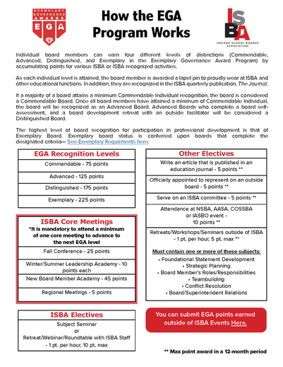 - Distinguished (Level 3) — Distinguished boards are second year Advanced boards. Each board member must earn a minimum of 25 additional EGA points. The board must also show evidence of a board retreat with an outside facilitator and complete an annual self-assessment with ISBA